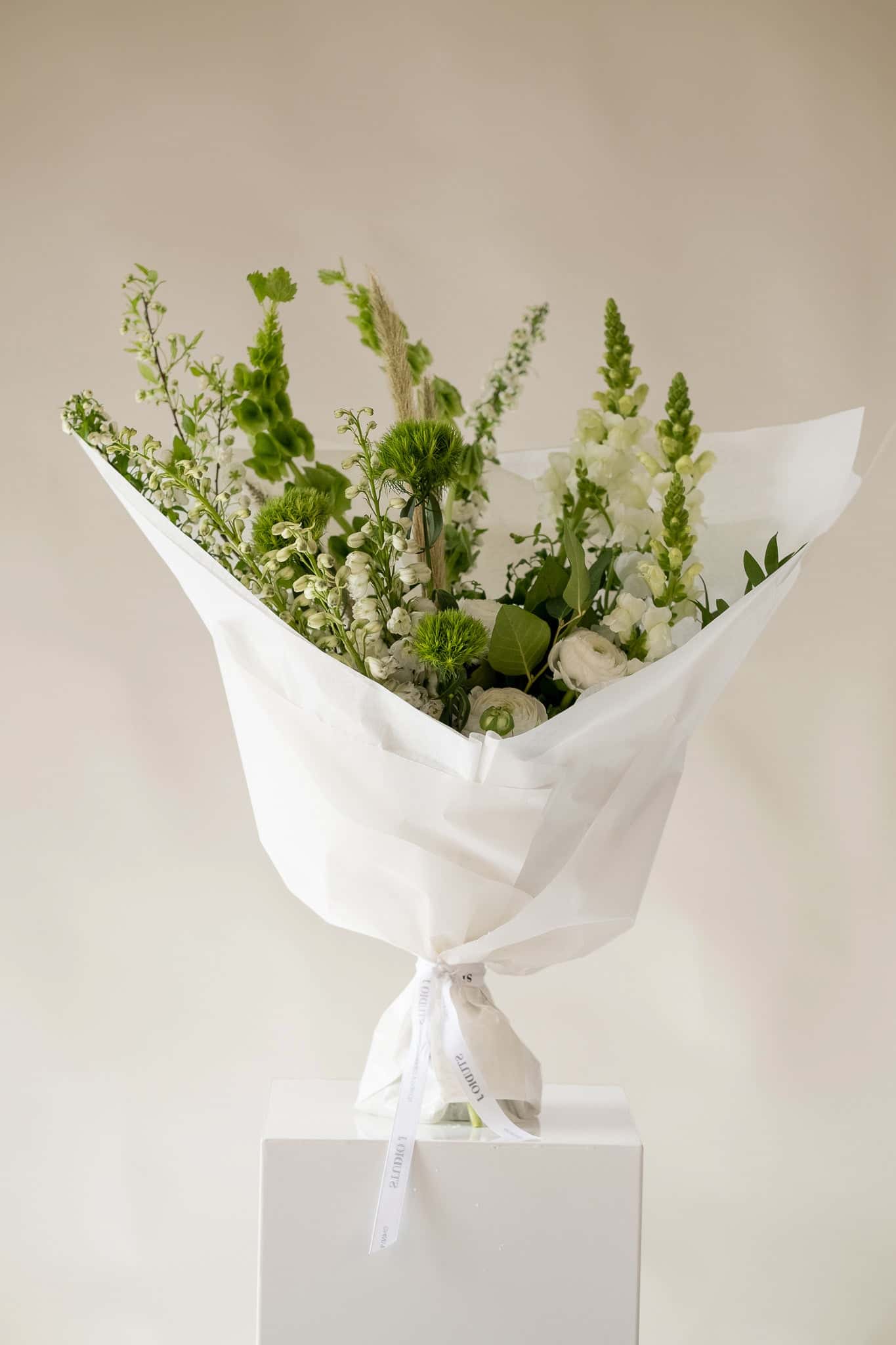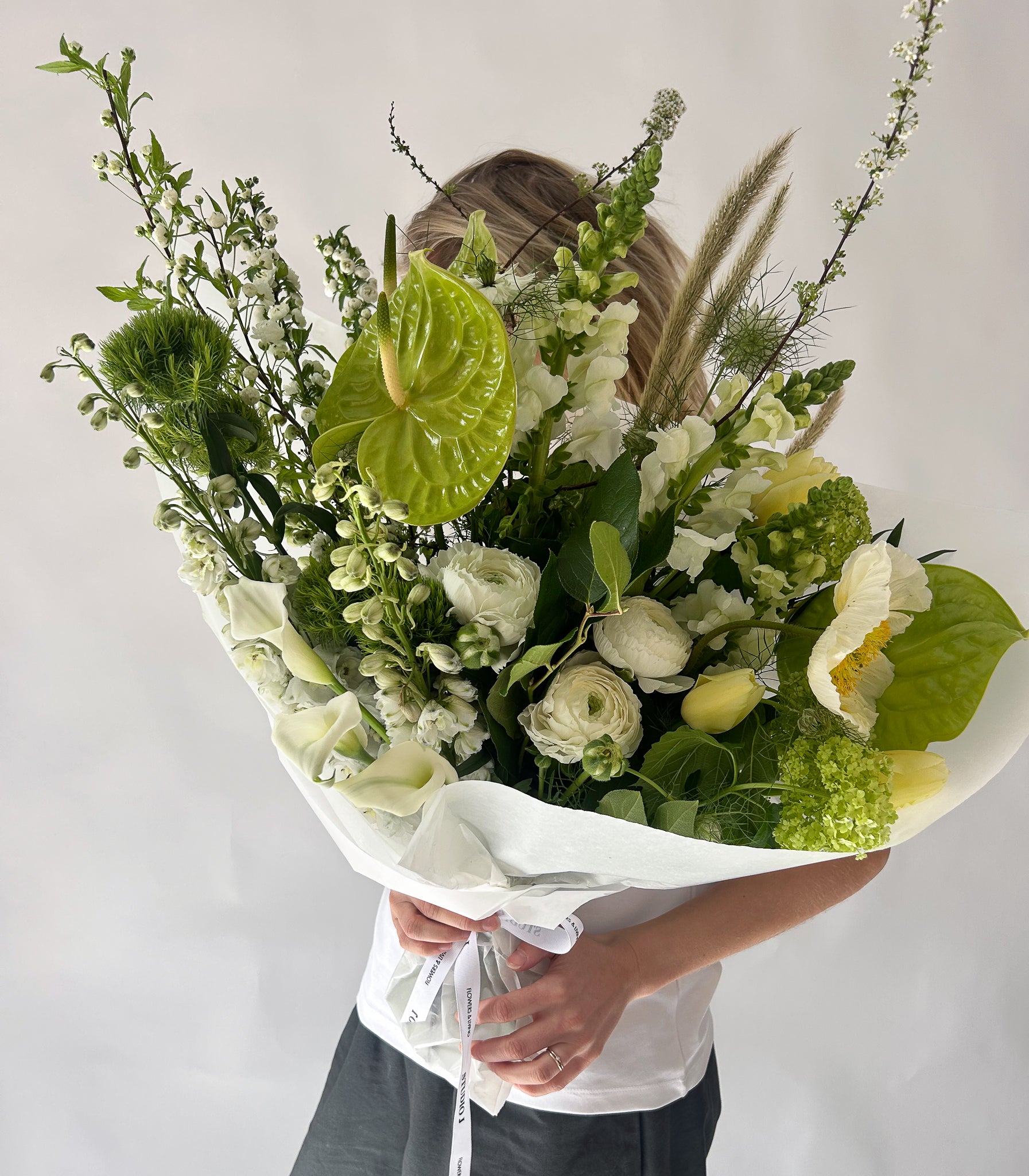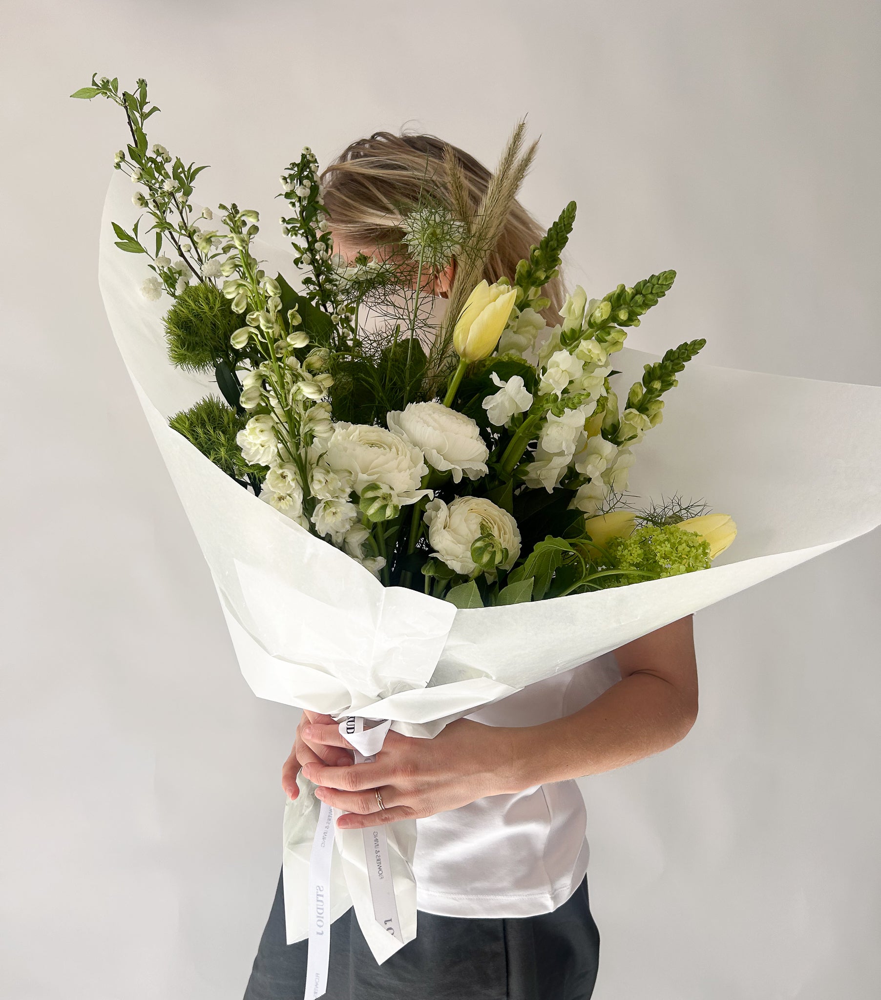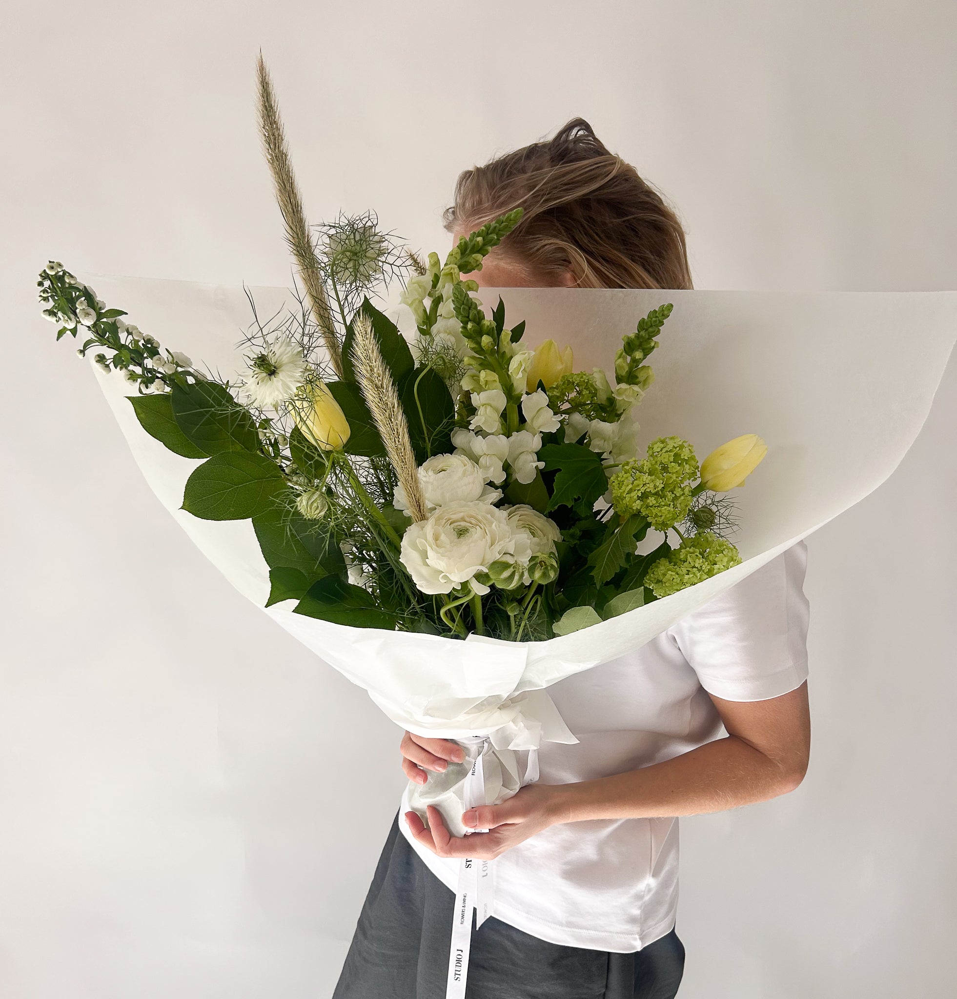 Den här buketten kombinerar vi i en mix av säsongs blommor, blandat med gröna blad, en ljus och sober färgskala ger en klassisk känsla. Levereras med vårt signaturpapper och sidenband.
