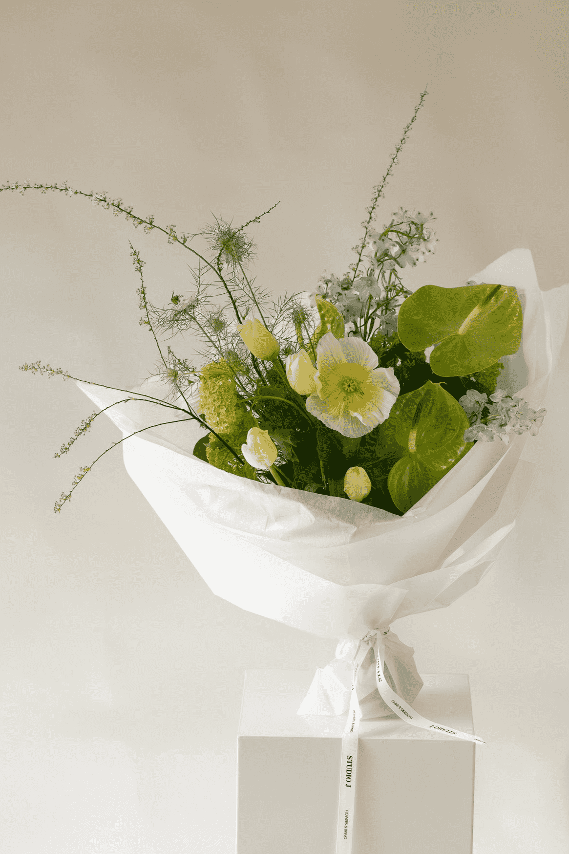 Den här buketten kombinerar vi i en mix av säsongs blommor, blandat med gröna blad, en ljus och sober färgskala ger en klassisk känsla. Levereras med vårt signaturpapper och sidenband.