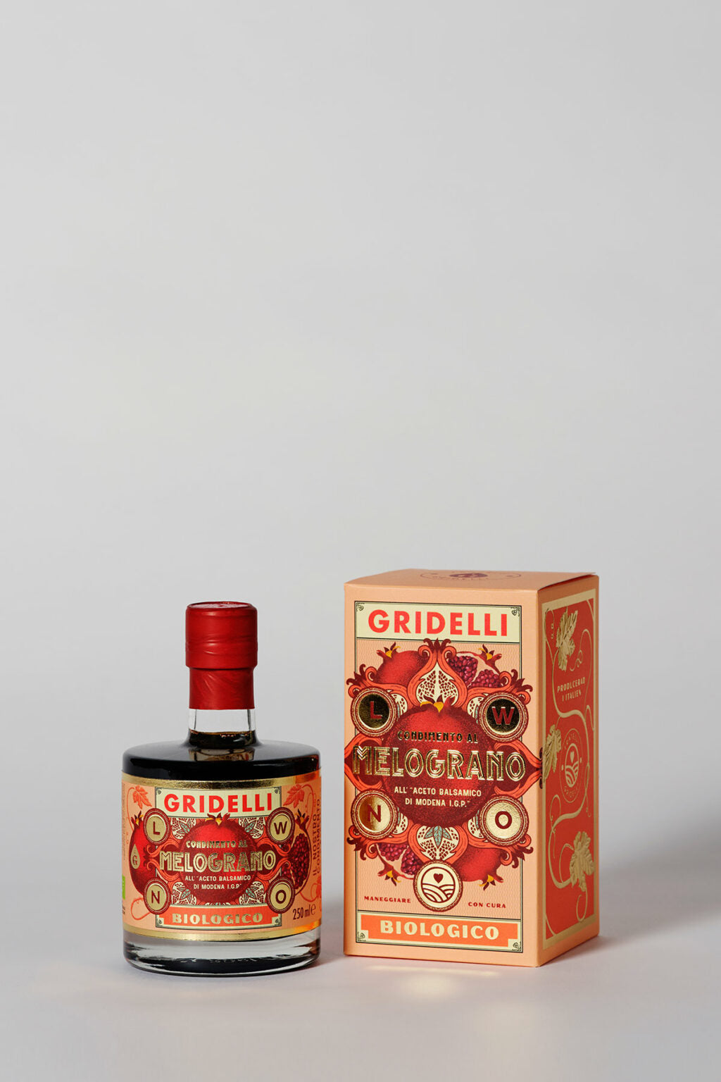 Gjord på ekologiska druvor från Emilia-Romagna. Innehåller 95,8% I.G.P.-klassad aceto balsamico di modena, 4% ekologisk granatäpple juice och 0,2% naturligaaromer. Passar fint ihop med olivolja till en sallad. God på egen hand till ostbrickan eller dessert, och en oväntad smaksensation att blanda fräscha drinkar med.