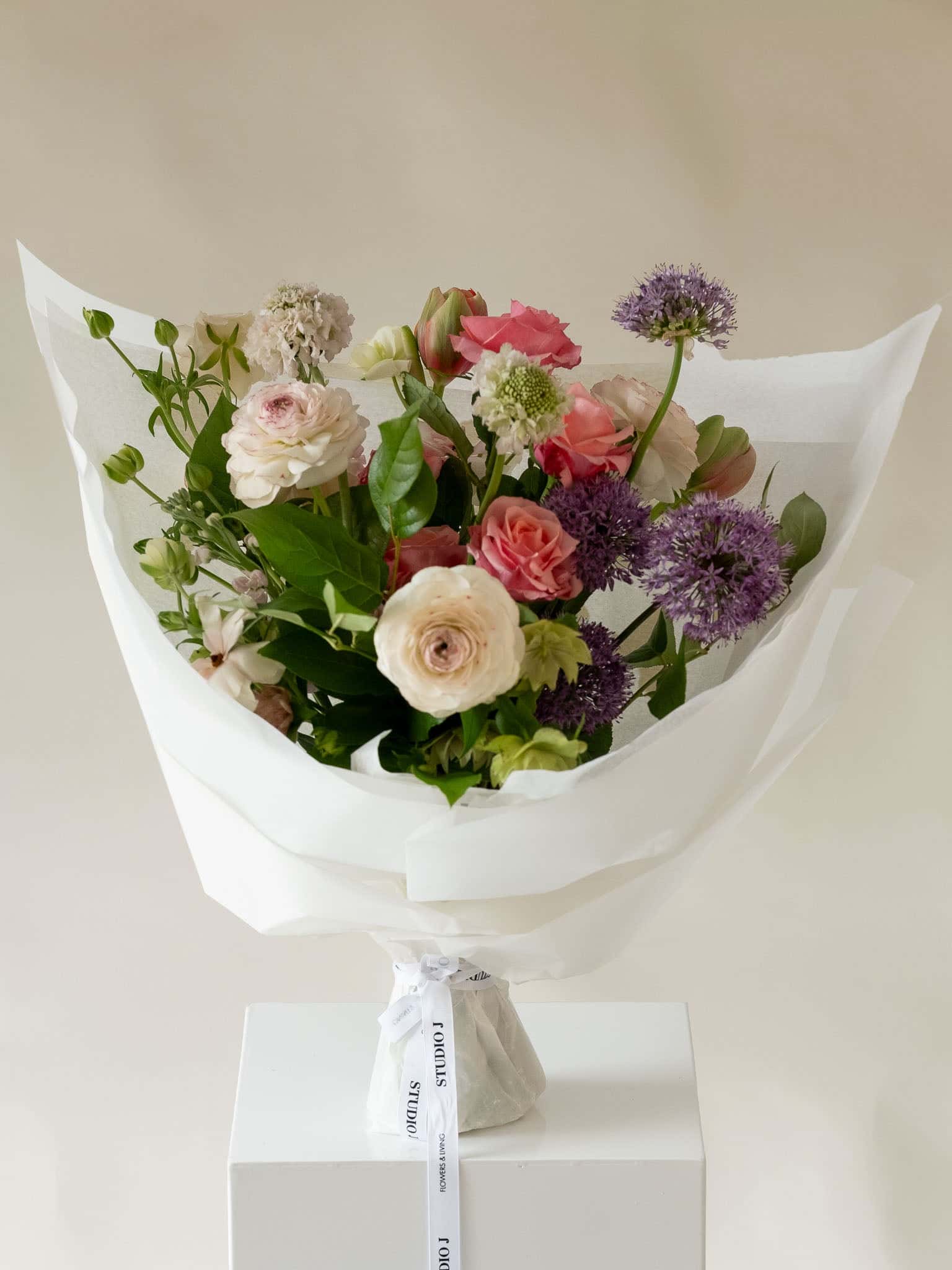 Varje bukett är unik och skapas efter floristens val, och kommer att variera beroende på säsong och tillgänglighet. Vi välkomnar önskemål om design, men kan inte garantera specifika sorter.